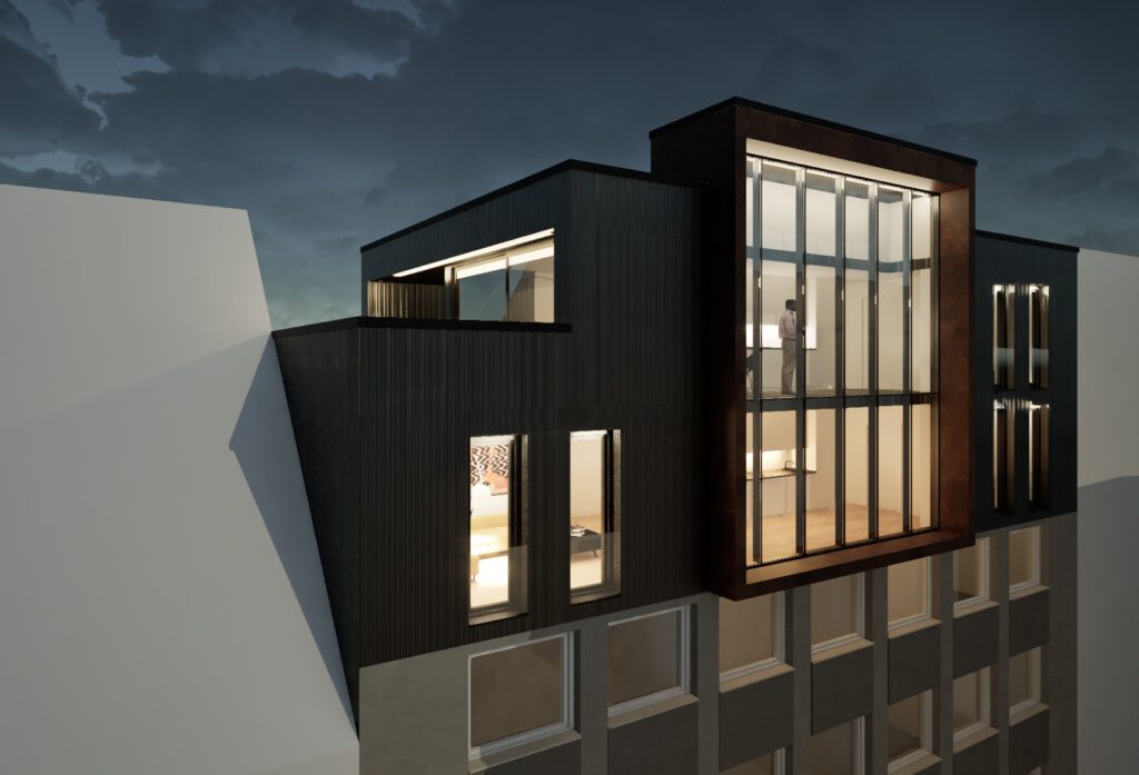 Der Eigentümer dieses Wohn- und Geschäftshauses in der Düsseldorfer Innenstadt hat Rehberg + Milesevic Architekten mit der Planung einer Aufstockung beauftragt. Das Konzept beinhaltet 2 neue Wohnungen im 5. und 6. OG mit einem Panoramafenster auf der Strassenseite und einer Dachterrasse.