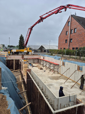 Nachdem das Hallendach fertiggestellt ist, wird heute mit Hilfe einer großen Betonpumpe in Köln – Riehl die Bodenplatte gegossen. Ca. 200 qbm Transportbeton oder 35 LKW -Ladungen sind erforderlich um den Boden für die Erweiterung des Self-Storage-Systems Freiraum zu bereiten.